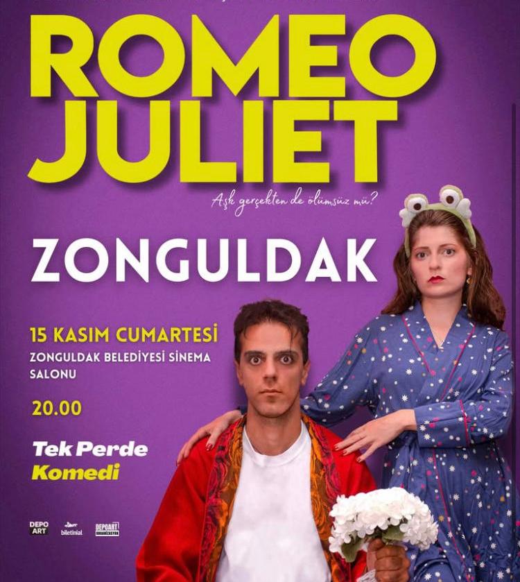 15 Kasım Cumartesi günü saat 20.00’de Zonguldak Belediye Salonunda perde açacak tek perdelik komedide; ilgiden çok didişmeye alışmış, geçim sıkıntısı içinde aşklarını yaşatmaya çalışan Romeo ve Juliet, izleyenleri çok başka bir pencereye sürükleyecek ve şu soru ile karşı karşıya bırakacak: Aşk gerçekten de ölümsüz mü?Biletler tükenmeden biletini al, bambaşka bir Romeo Juliet izleme şansını sakın kaçırma!