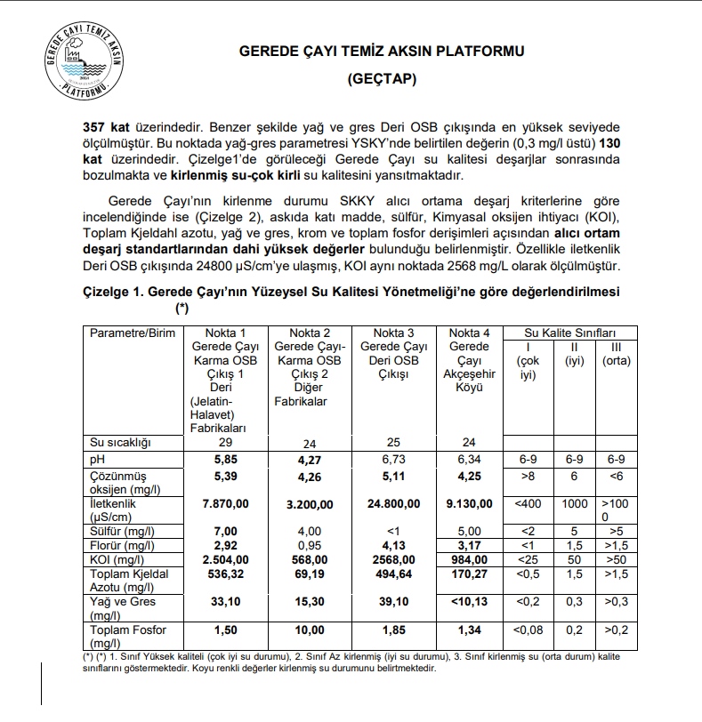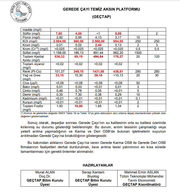 Gerede Çayı Temiz Aksın Platformu, aldırdıkları su numunelerinin akredite edilmiş bir laboratuvarca yapılan analizlerinde karma ve deri OSB’lerin faaliyetleri nedeniyle Gerede Çayı’nın çok kirlendiğini, aksine açıklamalar yapan yetkililerin kamuoyunu yanıltmaya çalıştığı iddia edildi. Platformdan yapılan açıklamada, “Gerede Çayı’nda yıllardır süren çevre felaketi, artık gizlenemez hale gelmiştir. Akredite laboratuvarlarda yapılan analizler halkın gözünün önünde yaşanan kirliliği kâğıt üzerinde de kanıtlamaktadır. 19 Mart 2025 tarihinde yapılan ilk akredite laboratuvar analizinde ağır kirlilik açık şekilde ortaya konmuş, çözünmüş oksijen seviyesinin balıkların ve diğer canlıların yaşayamayacağı düzeye indiği, suyun 3. sınıf “kirli su” kategorisine düştüğü belgelenmişti. 01 Ağustos 2025 tarihinde ikinci akredite laboratuvar analizinde de, acı gerçek, inkâr edilemez biçimde tekrar ortaya çıkmıştır.” denildi. VERİLER, GEREDE ÇAYI’NIN “ÇOK KİRLİ SU” SINIFINA DÜŞTÜĞÜNÜ GÖSTERMEKTEDİR.Ortaya çıkan değerlerle ilgili bilgiler de verilen açıklamada, “Toplam kjeldahl azotu yasal sınırın 357 kat (536,32 mg/L), yağ ve gres 130 kat (39,10 mg/L), KOİ (Kimyasal oksijen ihtiyacı) 10 kat (2.568 mg/L), askıda katı madde neredeyse 2 kat (354 mg/L), sülfür 3,5 kat (7 mg/L), toplam fosforsa, 5 kat üzerindedir (10 mg/L). Ayrıca iletkenlik 24.800 µS/cm’ye ulaşarak suyun yoğun atık yükünü gözler önüne sermiştir. Bu veriler, Gerede Çayı’nın ‘çok kirli su’ sınıfına düştüğünü ve neredeyse oksijensiz kaldığını göstermektedir.” şeklindeki bilgilere de yer verildi. KİRLİLİĞİN KATLANARAK ARTTIĞI ORTAYA ÇIKTIDaha önce yapılan analizle karşılaştırma da yapılan açıklamada, “19 Mart 2025’te yapılan ilk analizde kirlilik ağır seviyedeyken, 01 Ağustos 2025’te alınan ikinci örneklerde ise kirliliğin katlanarak arttığı görülmektedir. Yani geçen beş ayda herhangi bir iyileştirme yapılmamış, aksine arıtmasız deşarjlar nedeniyle çaydaki zehir yükü büyümüştür. Bu tablo arıtma tesislerinin çalışmadığını veya işletmelerin hiçbir arıtma yapmadan atıklarını doğrudan Gerede Çayı’na bıraktığını kanıtlamaktadır.” ifadeleri de yer aldı. BİZLERİ SERMAYE DÜŞMANLIĞI İLE SUÇLAYAN BOLU MİLLETVEKİLİ COŞKUNYÜREK, GERÇEKLERİ SAPTIRIYORBu tablonun sadece Gerede Çayı’nın değil, tüm Filyos Havzası’nın ve Karadeniz’in ölüm fermanı olduğu da dile getirilen açıklama, “Bu sonuçlara rağmen yetkililer, kamuoyunu yanıltıcı açıklamalar yaparak ‘değerlerin uygun’ olduğunu iddia etmektedirler. Bolu Milletvekili Sayın Yüksel Coşkunyürek, bizleri ‘sermaye düşmanlığı’ ile suçlayarak gerçeği saptırmaya çalışmaktadır. Oysaki analiz sonuçları ortadadır. Gerede Çayı’ndaki kirlilik oranları, yasal limitlerin katbekat üzerindedir. Filyos Irmağı, Havzası’nda yaşayan tüm halkı zehirlemekte, çocuklarımızın geleceği karartılmaktadır. Sayın milletvekili, halkı yanıltmak bir siyasetçinin görevi olamaz. Bu tavrınızla halkı değil, kirli üretimi sürdüren sermayeyi savunuyorsunuz ve halkın güvenini kaybediyorsunuz.” ifadeleriyle devam etti. HALKI YANILTAN BİR VEKİL DURUMUNDASINIZMilletvekili Coşkunyürek’e de seslenilen açıklamada, “Çaydaki suyun koyu rengini açıklarken ‘sorun arıtmada değil, arıtılan suyun can suyu ile seyreltilmemesinde’ diyerek bilimin en temel gerçeklerini alt üst eden bir yaklaşım sergiliyor, halkı yanıltan bir vekil durumuna düşüyorsunuz. Can suyu, kirliliği gizlemek için değil, suyu alınan havzalardaki canlıların yaşamını sürdürebilmesi için talep edilir. Bilim Kurulumuz bu konuyu çok önceden değerlendirmiş, hesaplamalar yapmış, kamuoyu ile paylaşmış ve canlılar için gerekli can suyu talebini ilgili kurumlara çoktan iletmiştir. Üstelik bırakılacak can suyunun gerçekten ‘can suyu’ olarak kalabilmesi için, üzerine kirli endüstriyel atık suyun karıştırılamayacağına biz değil, yürürlükteki yasalar hükmetmektedir. Yasalara herkes uymak zorundadır. Siz uzmanlık alanınızın dışındaki konularda açıklamalar yaparken bizleri ‘anlamıyorlar’ diye itham ediyorsunuz. Oysa unutmayın ki, bu Platform, bünyesinde Bilim Kurulu oluşturacak kadar işi ciddiye alan, bilimsel verilerle konuşan bir yapıya sahiptir.” denildi GEREDE’Yİ SEVİYORSANIZ, GELİN ÖNCE BÖLGE HALKINI DİNLEYİN, KÖYLÜNÜN ÇIĞLIĞINI DUYUNPlatformu “Gerede’ye düşmanlıkla” itham eden Gerede Ticaret ve Sanayi Odası Başkanı Sayın Ersin Kaşka’ya da seslenilen açıklamada, “Oysa Gerede Çayı’nın kenarında yaşayan köylüler yıllardır bu zehri soluyor, bu sudan tarım alanlarını sulayamıyor, hayvanlarına su veremiyor. Gerçek düşmanlık, halkın sağlığını hiçe sayıp kârı öncelemektir. Eğer gerçekten Gerede’yi seviyorsanız, gelin önce bölge halkını dinleyin, köylünün çığlığını duyun. Biz doğaya saygılı üretim istiyoruz.” ifadelerine de yer verildi. KURALLARA UYGUN ARITMA YAPMADAN ZEHİR AKITAN TÜM OSB İŞLETMELERİNİN FAALİYETLERİ DURDURULSUN “Fabrikalar lazım, hedefimiz refah” diyerek kirliliği görmezden gelen Bolu Valisi Abdulaziz Aydın’a da yanıt verilen açıklama, “Biz de soruyoruz; refah, birkaç fabrika sahibinin doğaya zarar vererek daha fazla para kazanması mıdır, yoksa halkın sağlıklı bir çevrede yaşaması mıdır? Geri dönülmez şekilde kirlenen bir doğa üzerine refah inşa edilemez. Gerçek kalkınma; doğayı yok ederek değil, sürdürülebilirlik ile mümkündür. Bugün bilimsel raporlar elimizde. Halkın yaşadığı gerçekler ortada. Bilimsel veriler yalan söylemez! Bizim talebimiz nettir: Kurallara uygun arıtma yapmadan zehir