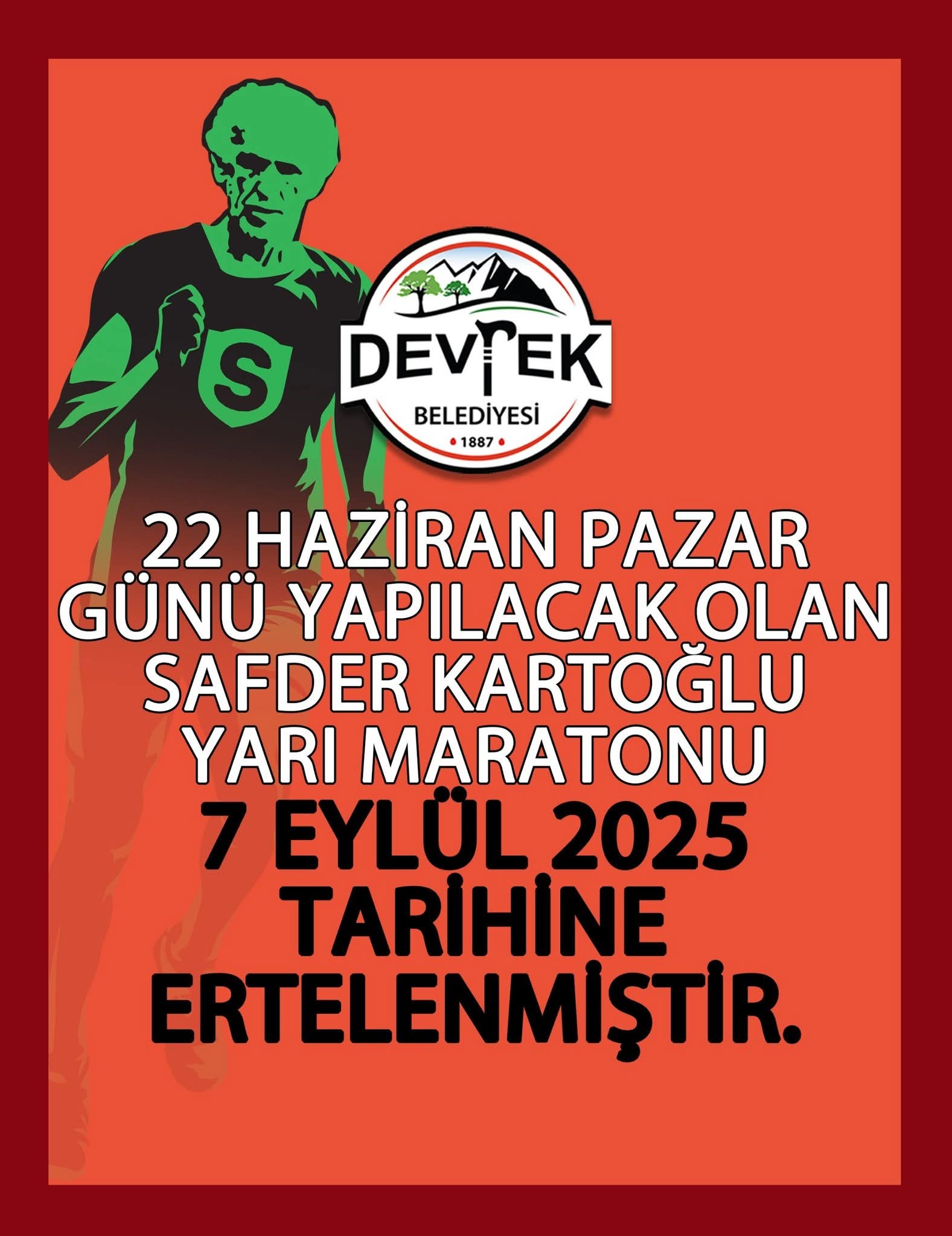 Zonguldak Yayınlanma: 16 Haziran 2025 - 19:02 Safder Kartoğlu Yarı Maratonu Ertelendi Zonguldak'ın Devrek Belediyesi tarafından düzenlenecek olan Safder Kartoğlu Yarı Maratonu ileri bir tarihe tarihi ertelendi. Zonguldak 16 Haziran 2025 - 19:02 Yorumlar Yazdır A Büyüt A Küçült Yorumlar Konuyla ilgili Devrek Belediyesi resmî sosyal medya hesabından yapılan duyuruda, "22 Haziran Pazar günü yapılacak olan Safder Kartoğlu Yarı Maratonu 7 Eylül 2025 tarihine ertelenmiştir" ifadelerine yer verildi. # Safder Kartoğlu# Yarı Maraton# Ertelendi EDİTÖR Merve Hasanoğlu YORUMLAR adlı kullanıcıya cevap x Gönder öncezonguldak10 ay önce Sebeb.Tabi ki yok Cevapla Beğen (0) Beğenme (0) İlginizi Çekebilir Afrikalı İşçilerle Horon Tepti 19 yaşındaki genç kız Tır'ın altında kaldı Türeli: “Son 24 Saatte 14 İşçi Hayatını Kaybetti” BAKKA’dan Uzman Personel Alımı: Başvurular Başladı! Son Haberler Afrikalı İşçilerle Horon Tepti 19 yaşındaki genç kız Tır'ın altında kaldı Türeli: “Son 24 Saatte 14 İşçi Hayatını Kaybetti” BAKKA’dan Uzman Personel Alımı: Başvurular Başladı! Yerel Mahkemeyi Yargıtay Bozdu: Özdemir Davayı Kazandı Zonguldak İlçeleri Alaplı Çaycuma Devrek Gökçebey Karadenizereğli Zonguldak WEGNER TİCARET FUARI’NA GELİYOR WEGNER TİCARET FUARI’NA GELİYOR
