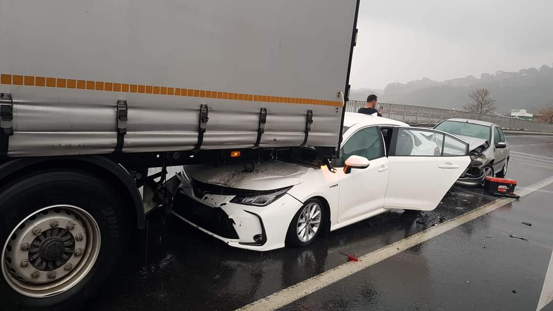 Sağanak yağış ve zeminin kaygan oluşu nedeniyle öndeki TIR’a çarpan araç, dorsenin altına girerken arkadan gelen üçüncü bir araç da kazaya karıştı.