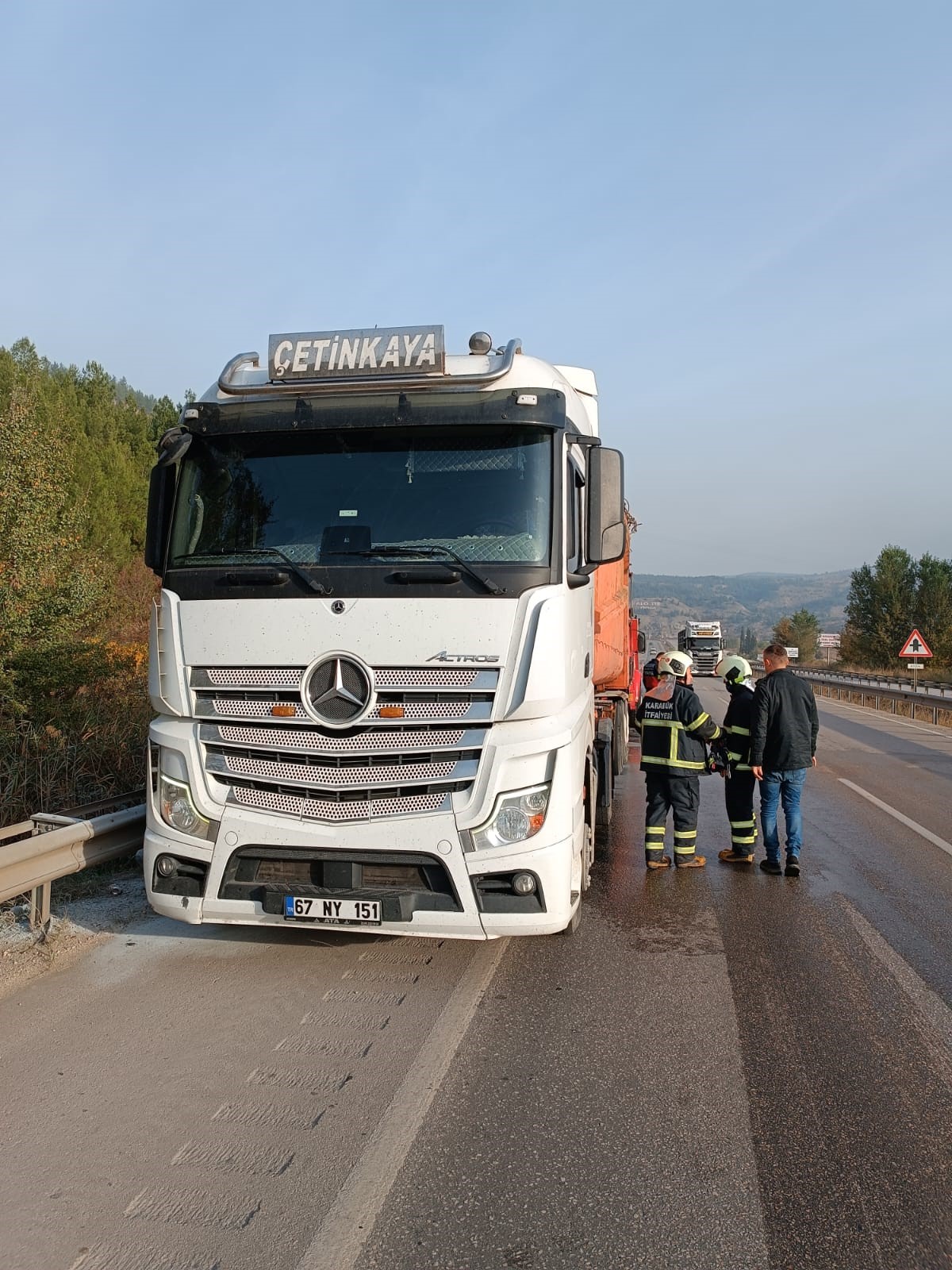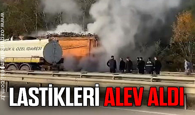 Olay sabah saatlerinde Karabük - Eskipazar karayolu Organize sanayi kavşağında meydana geldi. Sürücü S.K. idaresindeki 67 NY 151 plakalı Mercedes marka harfiyat kamyonuna bağlı 67 NA 429 plakalı romörkün arka sağ lastikleri alev aldı. Dumanların yükseldiğini gören sürücü aracını güvenlik şeridine çektikten sonra yoldan geçen sürücülerin de yardımı ile alevlere yangın tüpü ile müdahale etti. Bu sırada olay yerine yakın Özel İdaresine ait su tankerinin de müdahale ettiği alevlere olay yerine gelen itfaiye ekipleri tarafından kontrol altına alınarak kısa sürede söndürülürken çıkan yangın sonucunda maddi hasar oluştu.