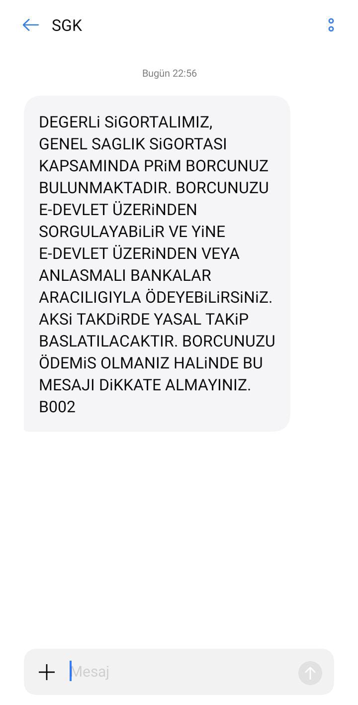 "DEGERLi SiGORTALIMIZ, GENEL SAGLIK SiGORTASI KAPSAMINDA PRiM BORCUNUZ BULUNMAKTADIR. BORCUNUZU E-DEVLET ÜZERiNDEN SORGULAYABiLiR VE YiNE E-DEVLET ÜZERiNDEN VEYA ANLASMALI BANKALAR ARACILIGIYLA ÖDEYEBiLiRSiNiZ. AKSi TAKDiRDE YASAL TAKiP BASLATILACAKTIR. BORCUNUZU ÖDEMiS OLMANIZ HALiNDE BU MESAJI DiKKATE ALMAYINIZ."