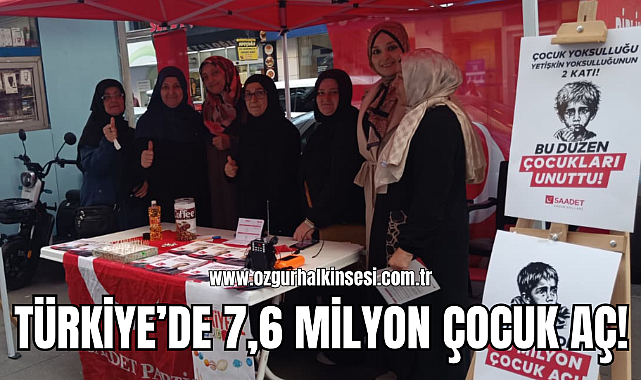 Saadet Partisi zonguldak İl Kadın Kolları Teşkilatı, 20 Kasım Dünya Çocuk Hakları Günü dolayısıyla Gazipaşa Caddesi'nde stand kurup, "Türkiye’de 7,6 milyon çocuk aç!" ve "Çocuk yoksulluğu yetişkin yoksulluğunun iki katı yazılı dövizler sergiledi.Caddeden geçen aile ve çocuklara broşür ve şeker dağıtan Saadet Partili Kadınlar, günün anlam ve önemine dair bir de basın açıklaması düzenledi.Basın açıklamasını okuyan Saadet Partisi İl Kadın Kolları Başkanı Pınar Keleş Zor, çocukların onurlu, güvenli ve sağlıklı bir geleceğe sahip olması için yürüttükleri mücadeleyi bir kez daha vurguladı.Açıklama şöyle:"Saadet Partisi İl Kadın Kolları Başkanı Pınar Keleş Zor, basın açıklamasında şu ifadeleri kullandı: Saadet Partisi olarak çocukların onurlu güvenli sağlıklı ve umut dolu bir geleceğe sahip olması için yürüttüğümüz mücadeleyi Bugün bir kez daha güçlü bir şekilde vurguluyoruz.