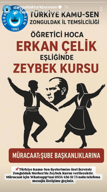 Sendikadan yapılan açıklamada, zeybek oyununu artırmayı hedeflenilen kursun, deneyimli eğitmen Erkan Çelik eşliğinde verileceği belirtildi.Yapılan açıklama şöyle: “Türkiye Kamu-Sen üyelerimize ve ilgilenen tüm vatandaşlarımıza ücretsiz zeybek kursu sunuyoruz. Kursumuz Zonguldak merkezde yapılacak. Katılmak isteyen herkesi davet ediyorum. Detaylı bilgi ve başvuru için 0534 456 51 73 numaralı telefon üzerinden iletişime geçebilirsiniz.”