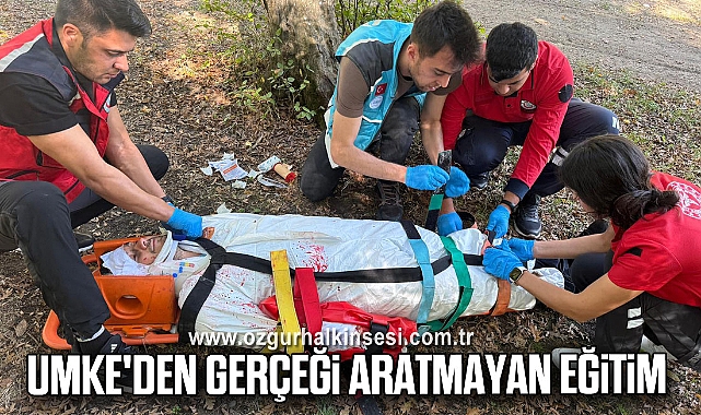 Zonguldak’ın Çaycuma İlçesi Sipahiler mevkiinde otuz kişilik sağlık ekibiyle çalışmalarını devam ettiren Ulusal Medikal Kurtarma Eğitimine katılan personellere UMKE eğitimciler tarafından zorlu koşullar altında ve trafik kazalarında ilk müdahaleler, yaralı taşıma teknikleri ve hızlı müdahaleler konularında geniş kapsamlı olarak eğitimler veriliyor.