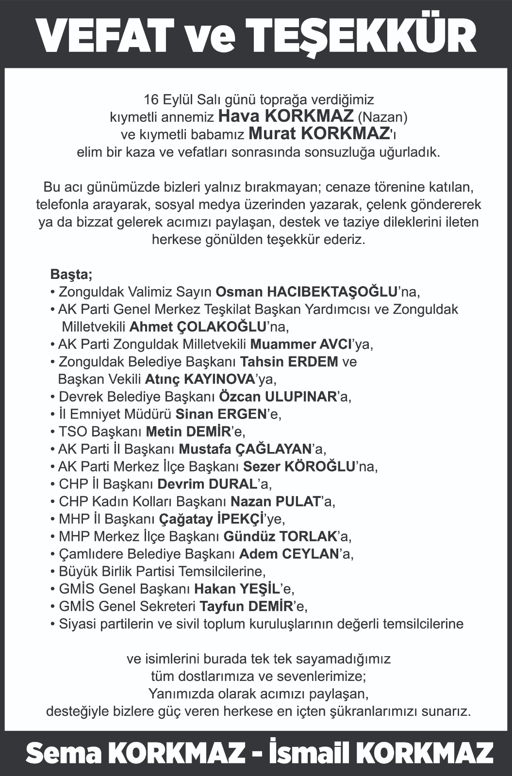Zonguldak Yayınlanma: 23 Eylül 2025 - 14:07 VEFAT VE TEŞEKKÜR Zonguldak 23 Eylül 2025 - 14:07 Yorumlar Yazdır A Büyüt A Küçült Yorumlar # Vefat ve Teşekkür# Korkmaz Ailesi EDİTÖR Merve Hasanoğlu YORUMLAR adlı kullanıcıya cevap x Gönder İlginizi Çekebilir Afrikalı İşçilerle Horon Tepti 19 yaşındaki genç kız Tır'ın altında kaldı Türeli: “Son 24 Saatte 14 İşçi Hayatını Kaybetti” BAKKA’dan Uzman Personel Alımı: Başvurular Başladı! Son Haberler Afrikalı İşçilerle Horon Tepti 19 yaşındaki genç kız Tır'ın altında kaldı Türeli: “Son 24 Saatte 14 İşçi Hayatını Kaybetti” BAKKA’dan Uzman Personel Alımı: Başvurular Başladı! Yerel Mahkemeyi Yargıtay Bozdu: Özdemir Davayı Kazandı Zonguldak İlçeleri Alaplı Çaycuma Devrek Gökçebey Karadenizereğli Zonguldak Deviren’den Erdem'e Ziyaret Deviren’den Erdem'e Ziyaret