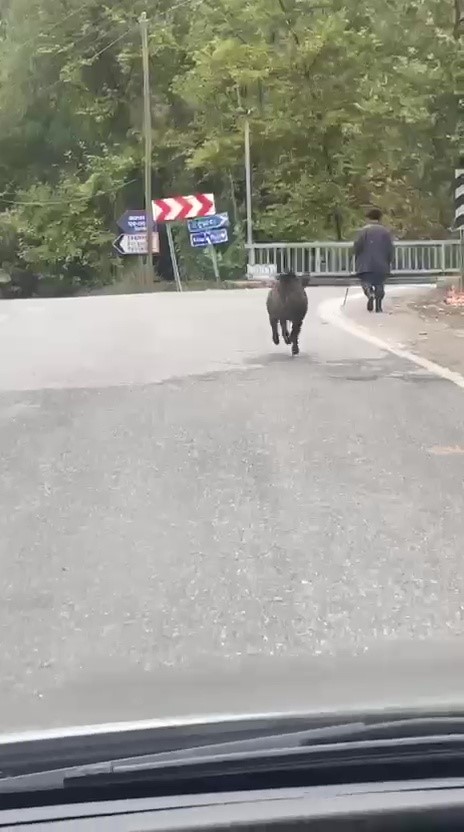 Devrek ilçesine bağlı Yağmurca köyünde, araçla ilerleyen bir sürücü tarafından kaydedilen görüntülerde ilginç bir an yaşandı. Görüntülerde, köy yolunda bir domuzun hızlı bir şekilde koştuğu görülüyor. Yol kenarında yürüyen yaşlı adama çarpacak gibi olan domuz, adamın son anda refleks göstermesiyle yoluna devam etti.