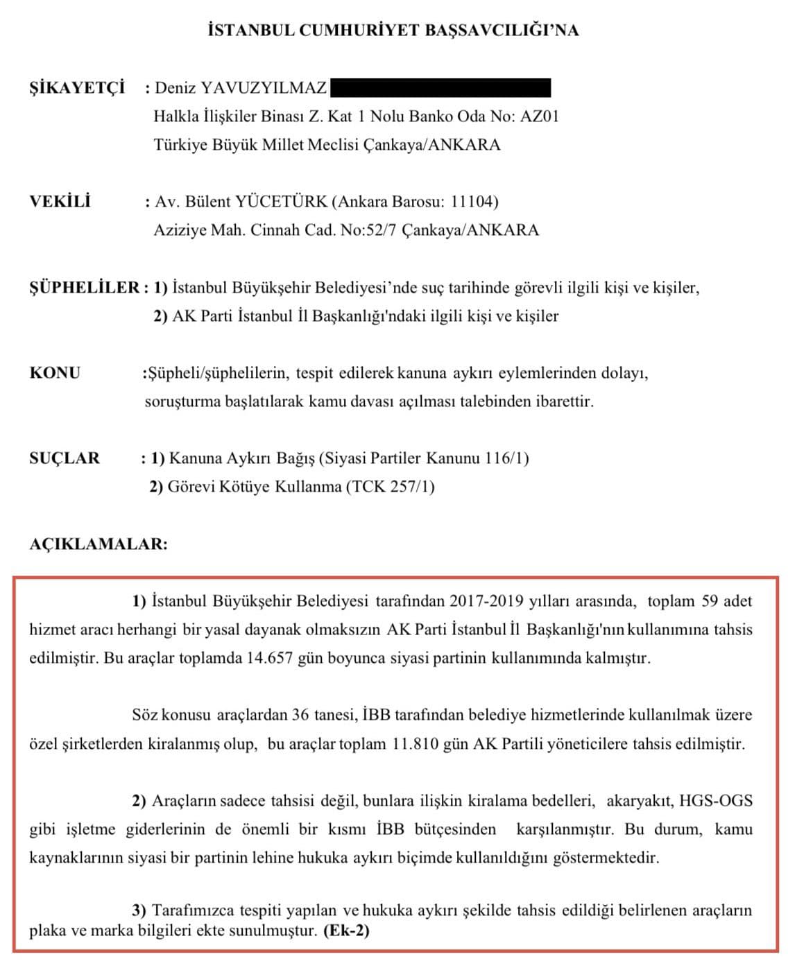 Yavuzyılmaz sosyal medya hesabından araçların plakalarını da paylaşarak, "Suç duyurusunda bulunduk! AK Parti dönemi İBB’de; Yasa dışı olarak, AK Parti İstanbul İl Başkanlığına, toplam 14 bin 657 gün tahsis edilen 59 araçla ilgili suç duyurusunda bulunduk. Bakalım kamu davası açılacak mı?" diye sordu.