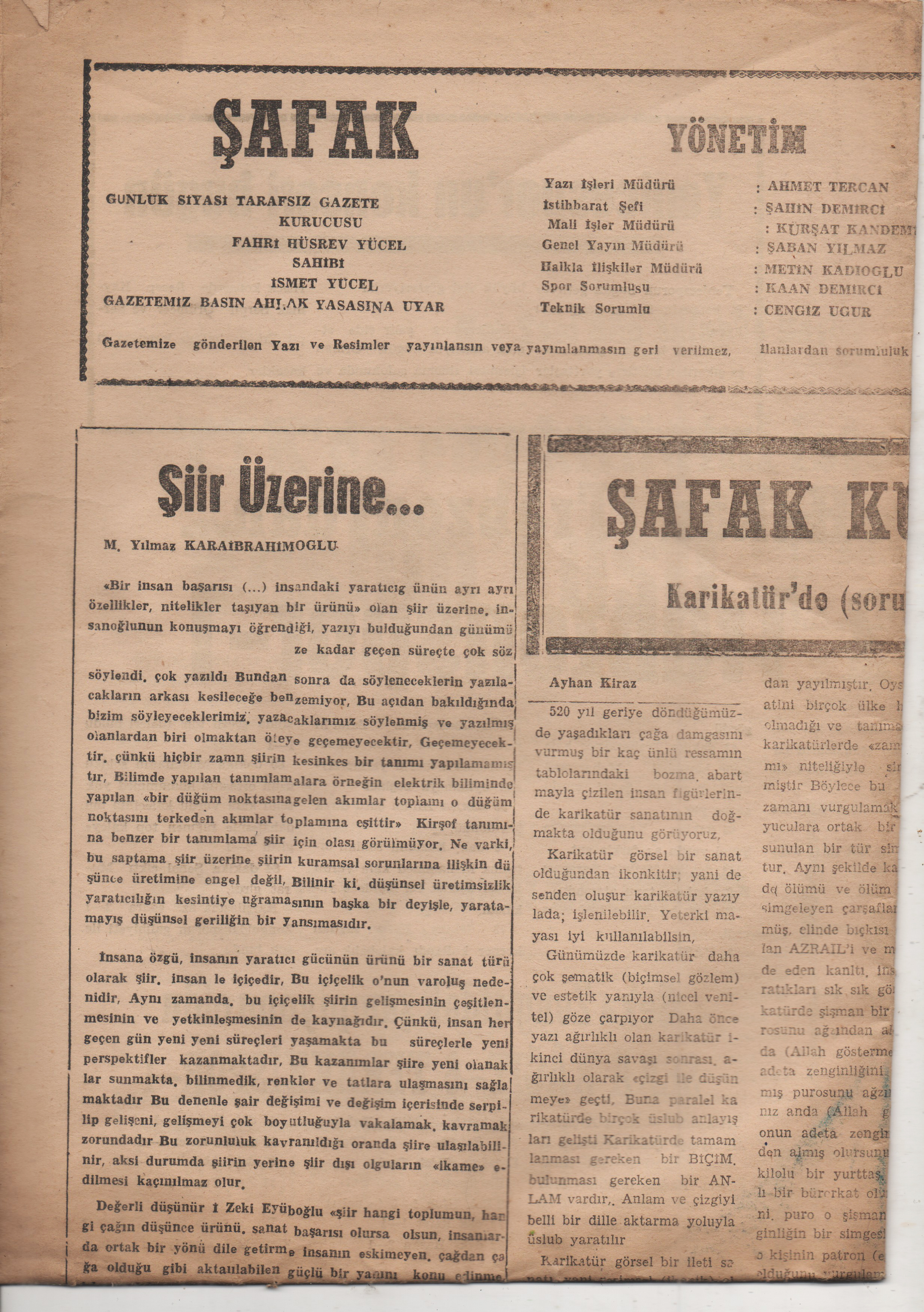 İşte o günlerde M. Yılmaz Karaibrahimoğlu imzasıyla hazırladığı kültür sanat sayfalı Şafak gazetesi geçti elime. Hem de onun o günlerdeki şiire bakışını anlatan bir makalesinin yer aldığı sayıydı bu. Tarih 20 Şubat 1989; gazete Şafak; “Yıl bir, sayı bir” yazıyor köşede… Demek ki ilk yayımın tarihi bu… Aynı sayfada karikatürist Ayhan Kiraz da karikatürde simgeler üzerine bir yazı yazmış. Zonguldak taşra; ama gördüğünüz gibi sorunlar evrensel. Okuyanı az da olsa sesleniş tüm sanat dünyasına. Aslında bu naif ama yaptığına inanan sanatçı çabalarımızı özlüyorum. Neredeyse hepsi, bir rüzgâr gülünden savrulan imgeler gibi zamana karışıp gidiyor.
