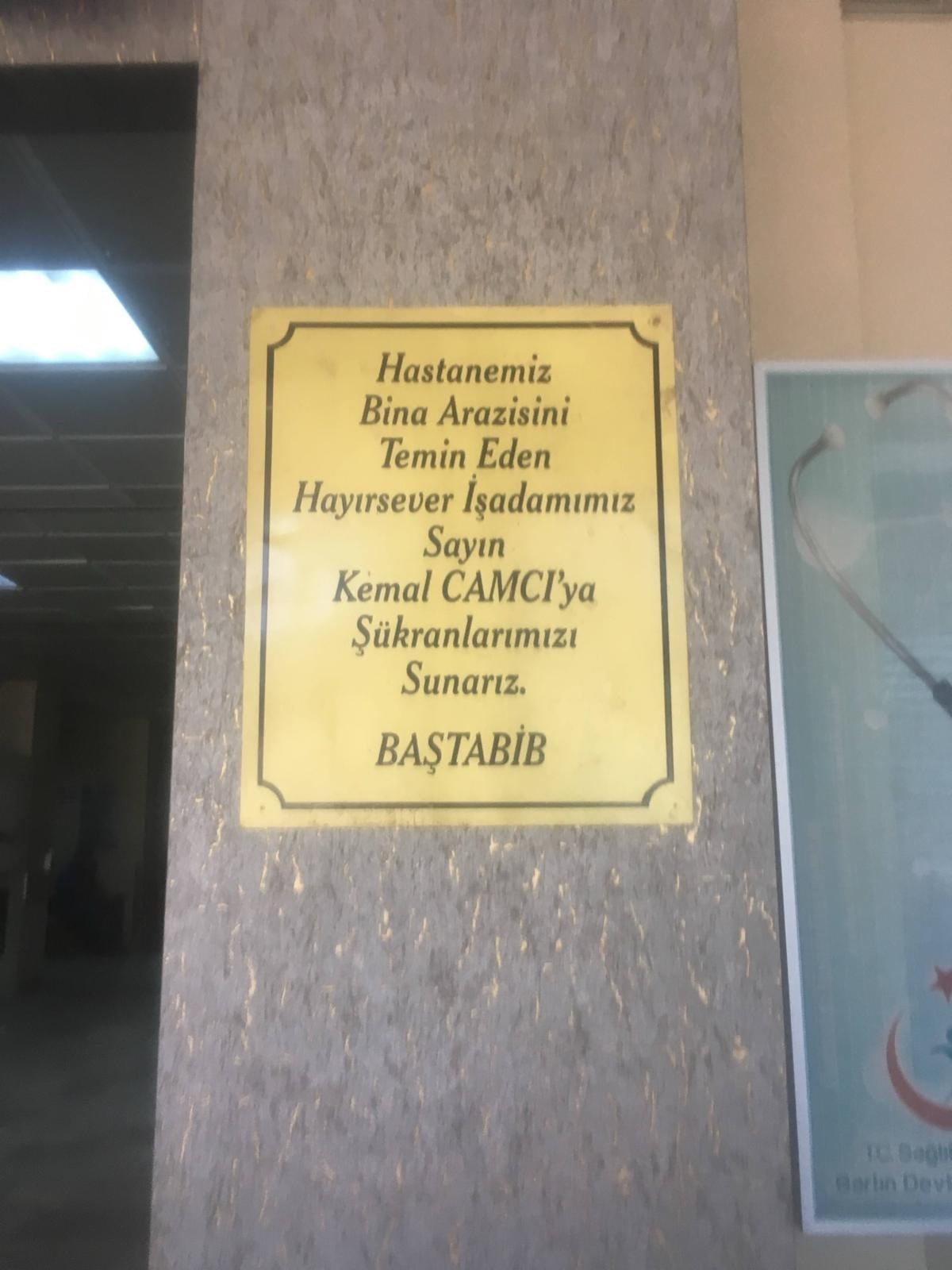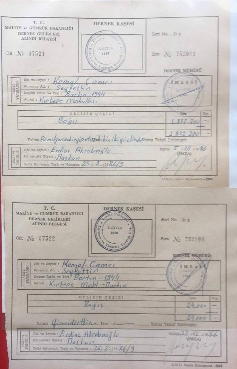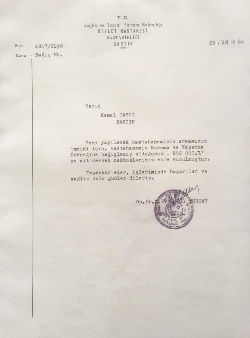 1980’lerde yeni bir hastane ihtiyacı doğunca, Bartın halkı el ele veriyor. 1992 yılında yeni devlet hastanesinin yapılacağı araziyi Sayın Kemal Camcı satın alıp bağışlıyor. (Belge: 1-2-3) Üstelik bunu sessiz sedasız, gösterişten uzak yapıyor. Sağlığında bu konunun konuşulmasını bile istemiyor. Ama bir şartı var: “Bu alan sadece sağlık için kullanılmalı.” Bu sözü herkes biliyor. Herkesin şahitliği var bu bağışa.