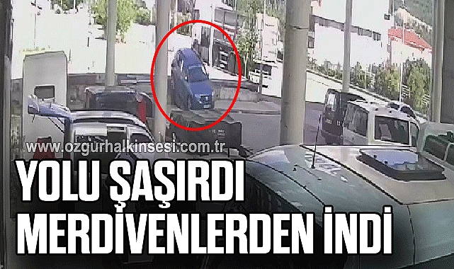 Merkeze bağlı 1042 No'lu Sokak'ta kadın sürücü otomobiliyle seyir halindeyken önünde bulunan merdivenleri fark edemedi. Otomobiliyle merdivenlerden inen sürücü ve otomobildekiler kısa süreli panik yaşadı. Otomobilin yolu şaşırarak merdivenlerden indiği anlar ise çevredeki bir iş yerinin güvenlik kamerasına yansıdı.