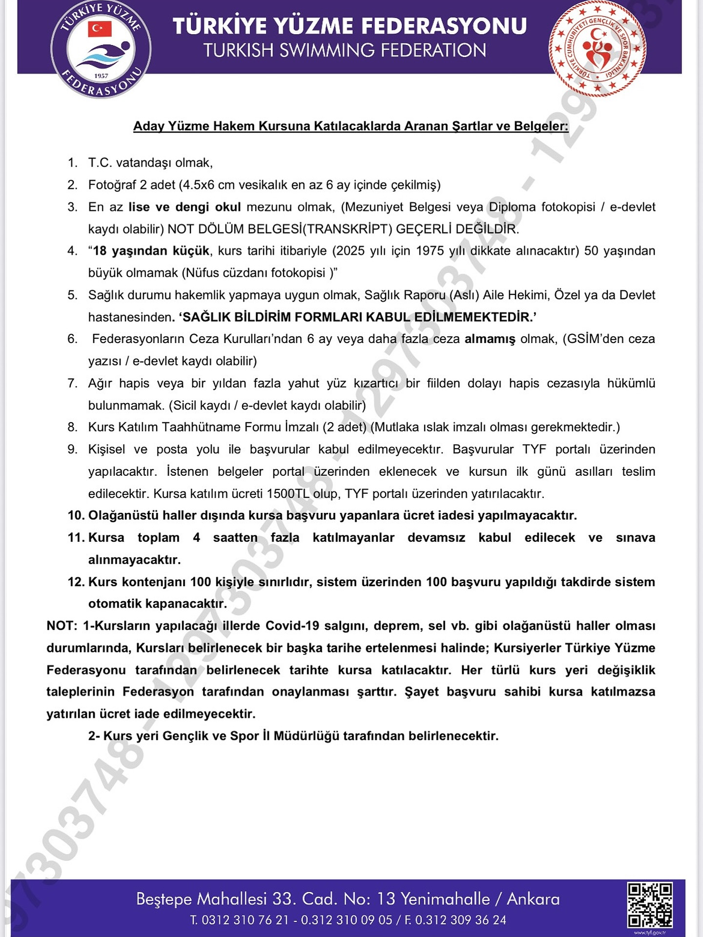 Türkiye Yüzme Federasyonu tarafından organize edilen kursa başvurular, federasyonun resmi portalı üzerinden alınacak. Yüzme hakemi olmak isteyen adaylar için önemli bir fırsat sunan kursa katılmak isteyenlerin, en geç 14 Ekim 2025 tarihine kadar başvurularını tamamlamaları gerekiyor.