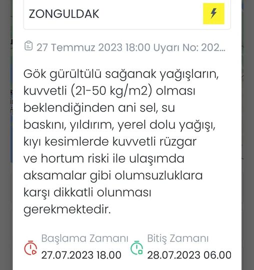 Meteorolojiden yapılan son değerlendirmelere göre; gök gürültülü sağanak yağışların, kuvvetli (21-50 kg/m2) olması tahmin ediliyor.