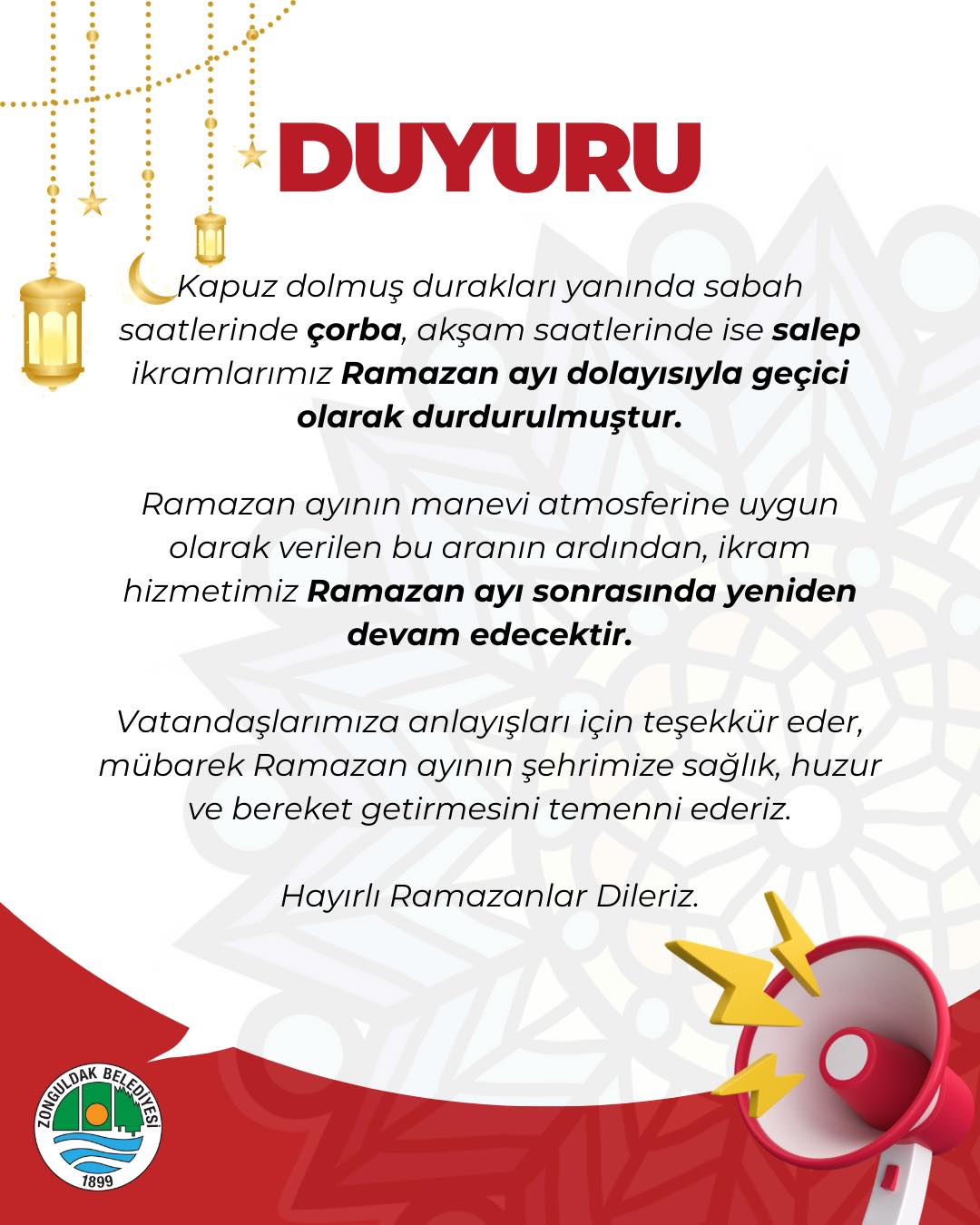 Belediyeden yapılan açıklamada, Ramazan ayının manevi atmosferine uygun olarak verilen aranın ardından ikram hizmetlerinin Ramazan ayı sonrasında yeniden başlayacağı belirtildi.